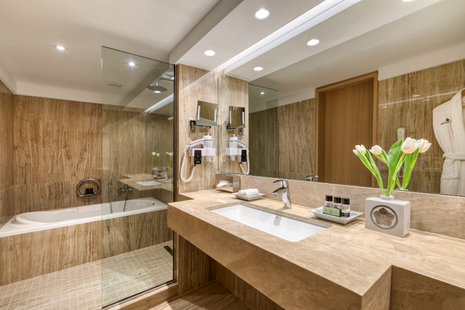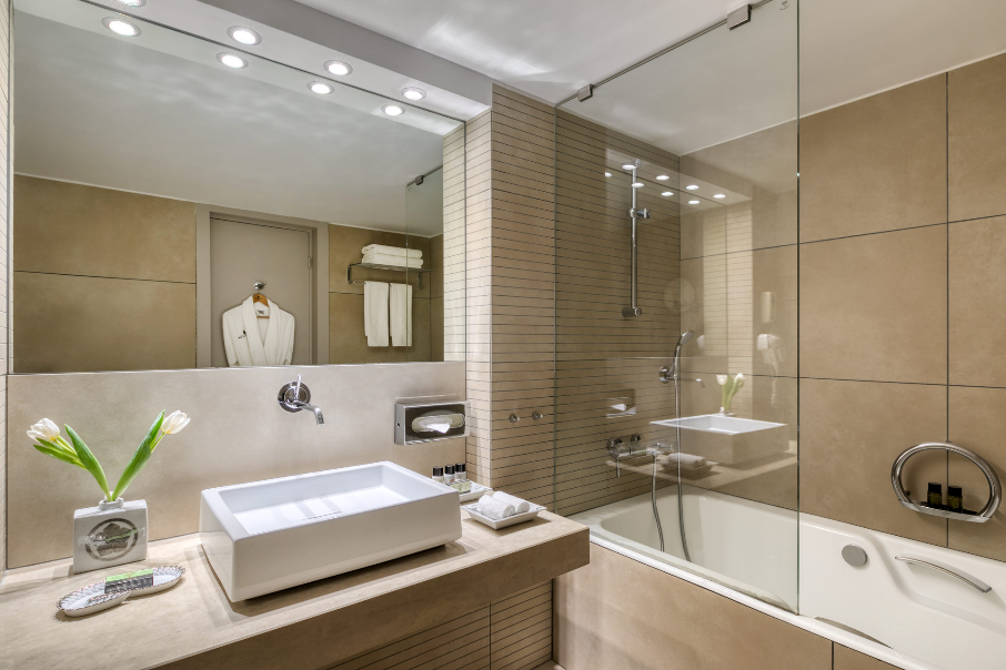 With a double or two twin beds, sofa area, bathtub, and shower.