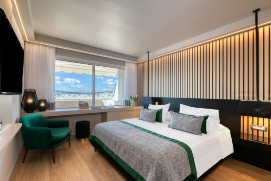 With a queen bed, a living area, and shower. Features a view of the Acropolis.