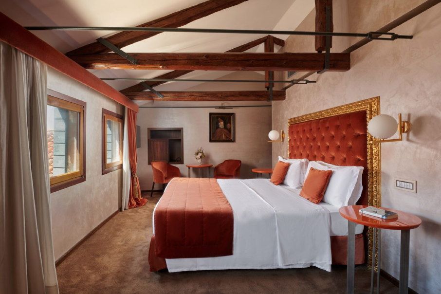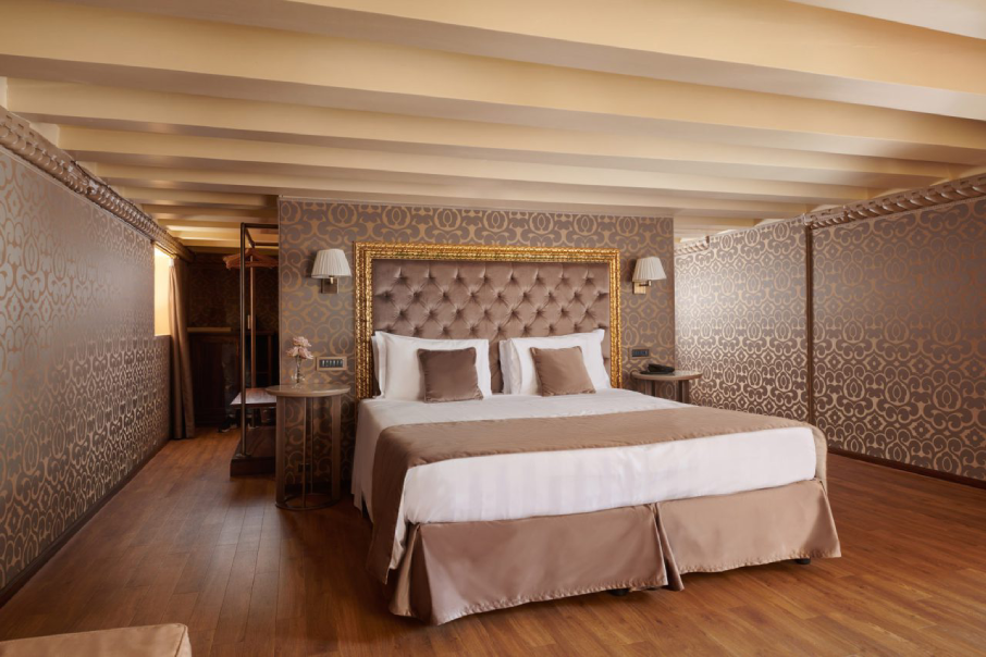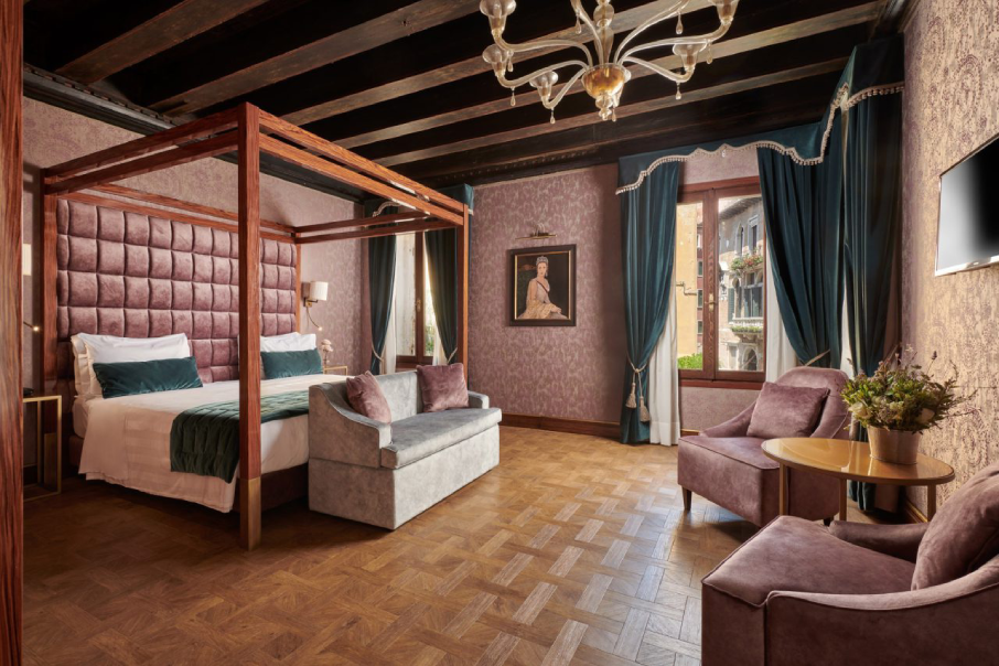 With a double bed and spa bathtub. Features a view of the Rio de Palazzo canal.