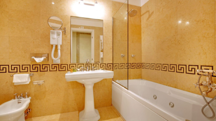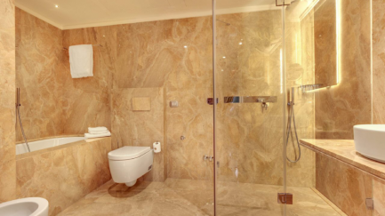 With a double bed and bathtub or shower.
