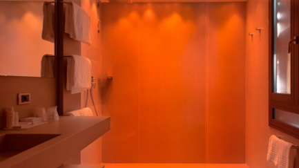 Top floor apartment of a separate building. With two bedrooms each with a double bed. Features a panoramic view and a wellness suite consisting of a sauna, steam bath and whirlpool tub.