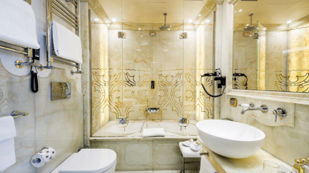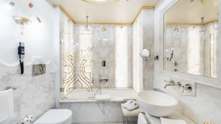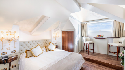 With one double bed and bathtub and shower. Features a view of the Grand Canal and St. Mark’s Basin.
