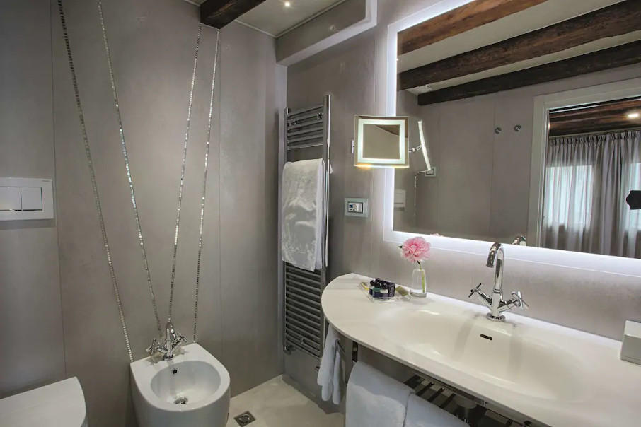 Venice (Santa Lucia) - 0.25 miAll the rooms are decorated following the rules of the Venetian style and tradition: wall fabrics, fitted carpets, Venetian-style flooring, parquet, uncovered beams, Murano glass chandeliers…all the particulars and complements which give a diverse personality to all the rooms. The rooms face on different sides: the Grand Canal, the side canal of Rio Nuovo, the Gardens or Piazzale. The rooms in the Annex have the view on the Courtyard.