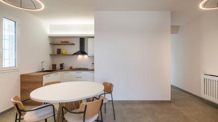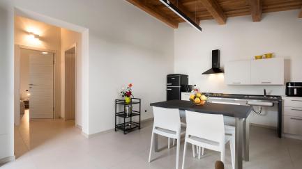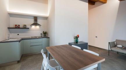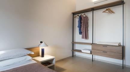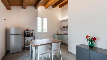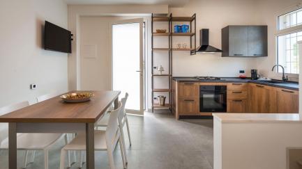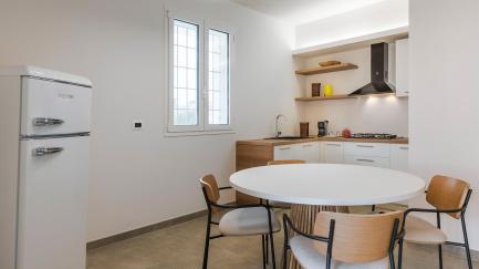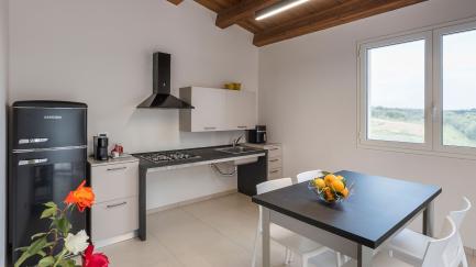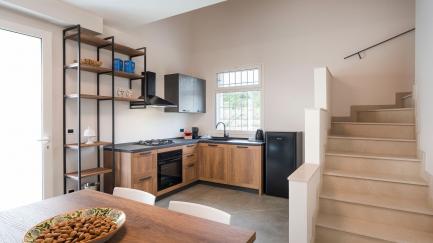 There is a common room with a well-equipped kitchen, a large table for eating all together, and a large living area where everyone can relax at the same time.