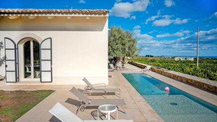 The villa is surrounded by the Sicilian countryside, lush with citrus trees and centuries-old olive trees, for a picturesque island vacation.