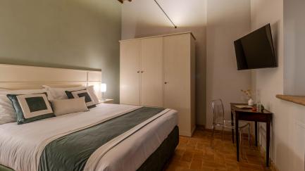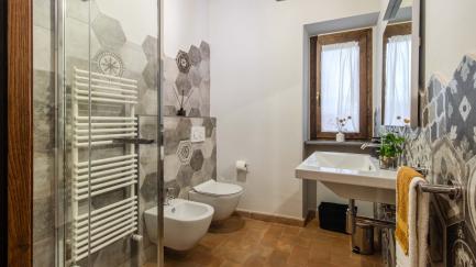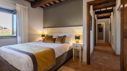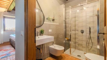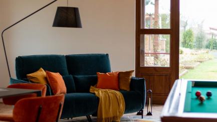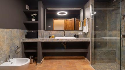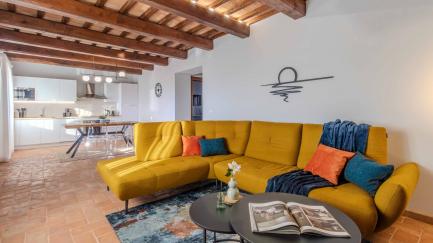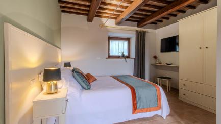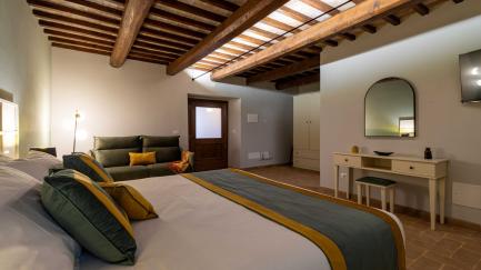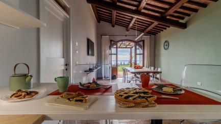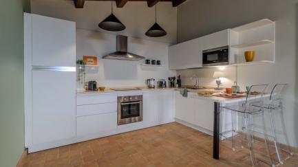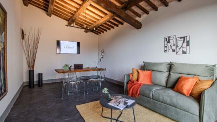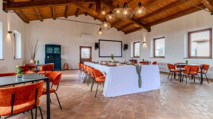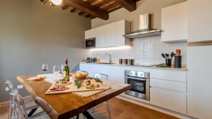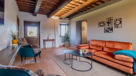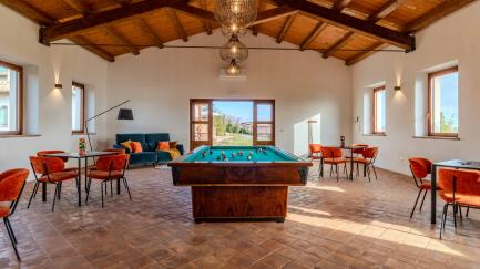Tenuta Poggio Guiano is made up of 5 units (not connected on the inside) which are rented together to one group at a time. A spacious room offers a well-equipped kitchen with a large table for eating all together, and an annex houses a large living area where everyone can lounge and relax.
