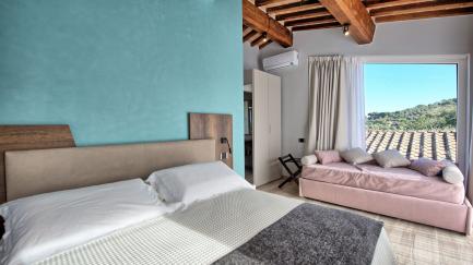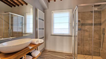 Villa Acquaviva offers a pool with panoramic views that has a relaxation area with two waterfalls. Water overflows from the infinity edge into a shallow pool below with easy walk-in entry. This second pool is perfect for children. An automatic cover keeps the pool clean and maintains a pleasant temperature even in spring and autumn.