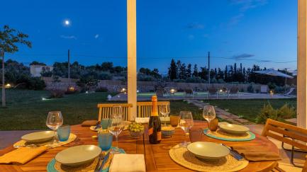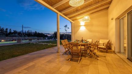 It features large outdoor spaces, a private pool, and a veranda with an outdoor dining area.