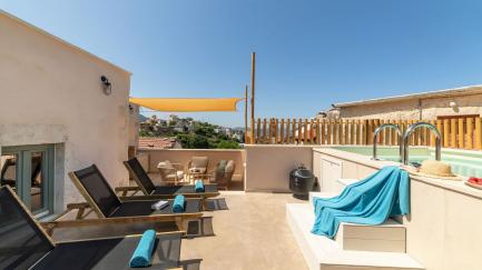Outside, there is a lovely private pool on the first floor terrace (heatable upon request); on the ground floor there is an outdoor dining area furnished with a table and chairs. Less than 5 km away is Lake Kournas, where you can rent small row boats and explore the lake’s clear waters; take lovely walks; or eat at one of the many restaurants. The sea (free access beaches and beach club facilities) is just 6 km away from the property.