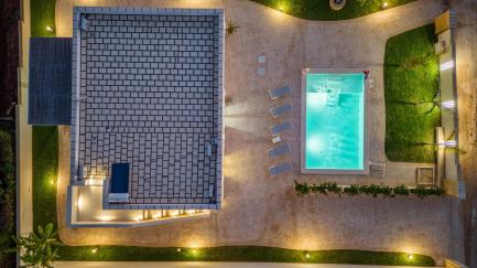 The villa offers spacious outdoor areas, a private pool, and a veranda equipped for outdoor dining.
