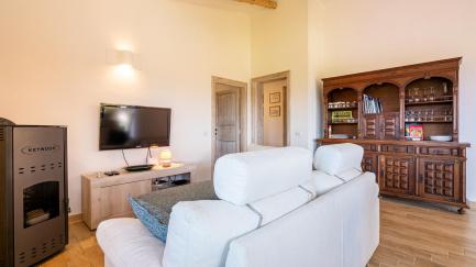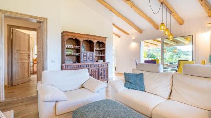 Outside on the grounds, you can relax by the scenic private pool, in the large sunbathing areas, and dine outside on the terrace while enjoying beautiful views of the surrounding landscapes all the way to the sea.